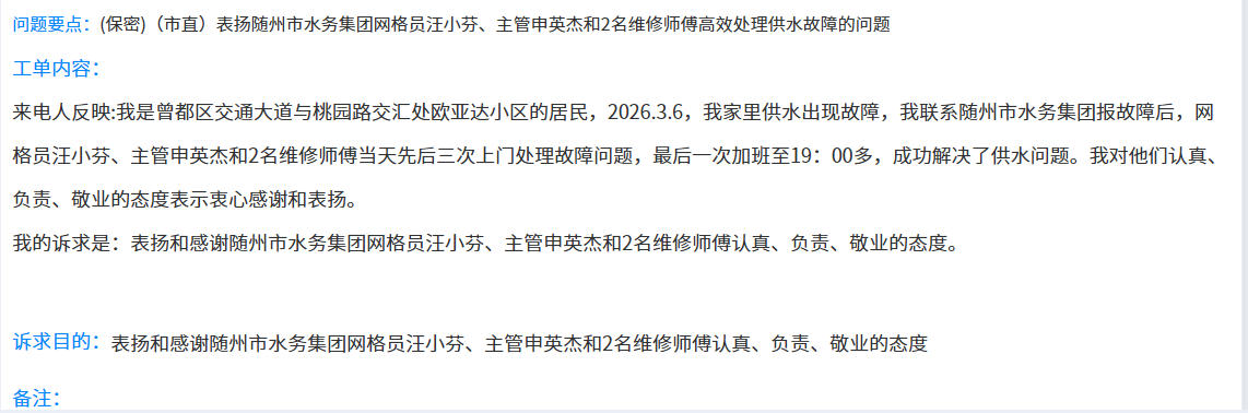 一通表揚(yáng)熱線,一份民生信任。此次暖心服務(wù)是隨州水務(wù)集團(tuán)踐行“以客戶為中心”理念的縮影。下一步,集團(tuán)將以此為動(dòng)力,持續(xù)優(yōu)化供水服務(wù)舉措,高效解決市民用水難題,全力守護(hù)用水安全,不斷提升市民獲得感與幸福感,更以暖心便民的供水服務(wù)為隨州優(yōu)化營商環(huán)境,提升城市發(fā)展軟實(shí)力持續(xù)賦能,進(jìn)一步筑牢城市發(fā)展的水利民生根基。